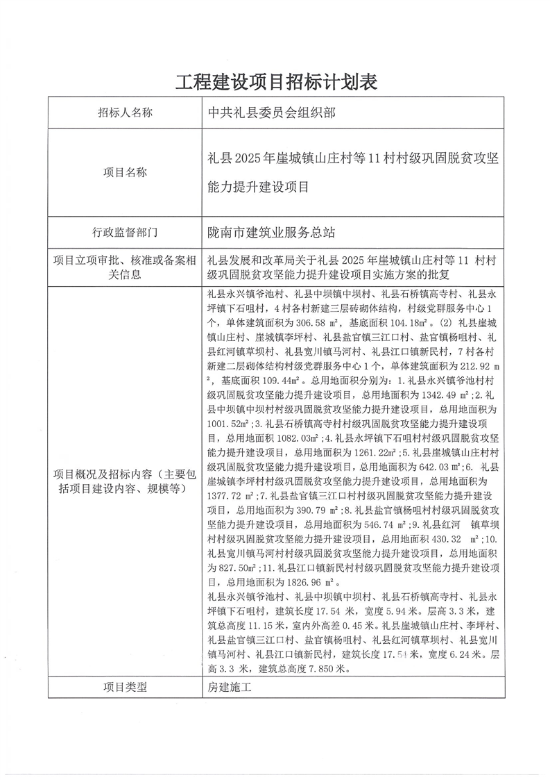 禮縣2025年崖城鎮(zhèn)山莊村等11村村級(jí)鞏固脫貧攻堅(jiān)能力提升建設(shè)項(xiàng)目